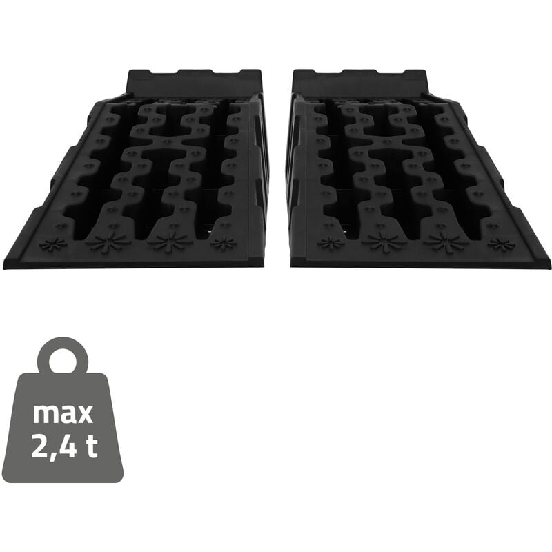 Contenuto: 1x set di rampe (2 pezzi) Dati tecnici: Materiale: plastica, nero Peso: circa 5 kg / coppia Capacità: circa 2,5 t / coppia Larghezza massima: circa 240 mm Quantità: 2 pezzi Caratteristiche: Costruzione in plastica ad alta stabilità, particolarmente affidabile Divisibile per risparmiare spazio e facile da trasportare Proprietà antiscivolo grazie al profilo profondo Capacità massima di circa 2,5 tonnellate (circa 1,25 tonnellate per rampa) Per larghezze di pneumatici fino a circa 240 mm Lavoro sicuro garantito Descrizione articolo: Questo pratico set di rampe è un must in ogni garage o officina e garantisce la massima stabilità grazie alla robusta costruzione in plastica. Questo vi permette di lavorare in sicurezza sotto il vostro veicolo o di passare cordoli alti con auto abbassate. Le rampe garantiscono una presa ottimale grazie alle loro proprietà antiscivolo e al loro profilo profondo. Grazie al peso ridotto di circa 2,5 kg per rampa e alla divisibilità dei singoli