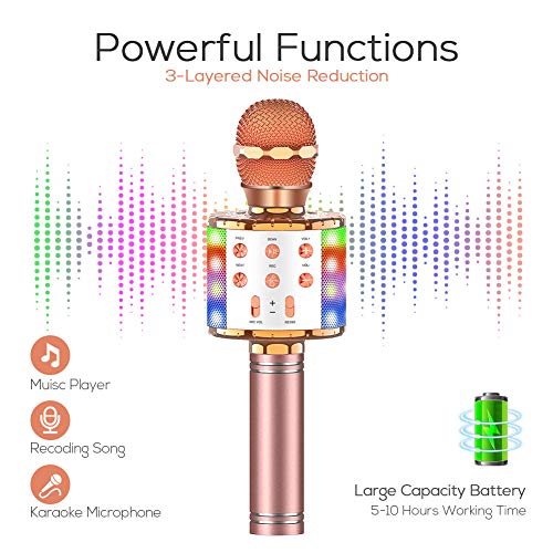 Audio di qualità e luci LED - La tecnologia avanzata di riduzione del rumore a 3 strati garantisce un suono cristallino e di alta qualità. Suono dal vivo KTV sorprendente e ritmo musicale chiaro con riverbero dell'eco. Il microfono si illumina con luci LED danzanti insieme alla voce e al volume della musica, rendendo la festa più allegra.