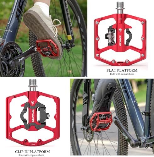 GEWAGE Pedali per mountain bike - Pedali piatti per bicicletta a doppia funzione e pedali SPD - Pedali con piattaforma da 9/16" compatibili con SPD per bici da strada Mountain BMX (Rosso)