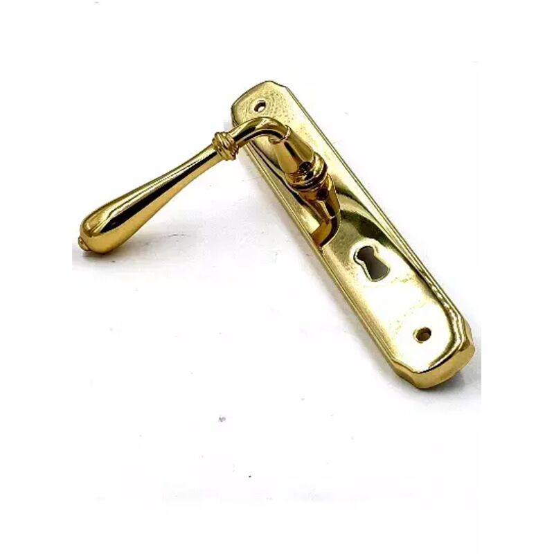 Maniglia GPB Novecento in Ottone finitura Lucida, foro patent su placca con distanza dal quadro maniglia al foro chiave mm.70 La confezione comprende 2 Maniglie con molla di ritorno e il ferro quadro di collegamento ( foto ) Misure: Maniglia 120 mm Altezza placca 230 mm Larghezza placca 40 mm Colore: Ottone Lucido