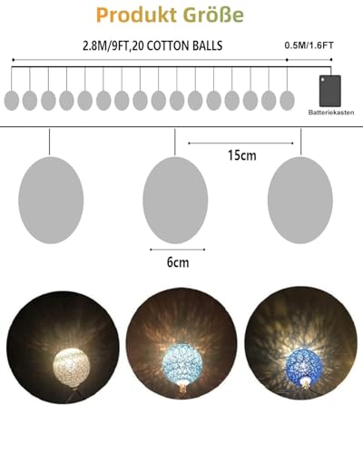Decorazione Perfetta: La catena luminosa è dotata di 20 pallina di cotone con luci led, luce bianca calda morbida dà una sensazione comoda, accogliente e romantica, è una buona scelta per la decorazione di camera da letto, casa, compleanno, matrimonio, Natale, Halloween e altre feste.