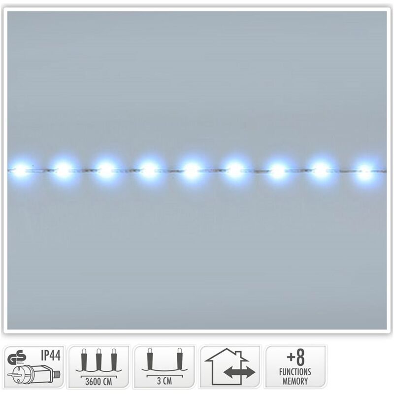 Ghirlanda in filo morbido 1200 led bianco freddo 36m 8 funzioni. filo trasparente, distanza lampadine: 3 cm, filo conduttore: 3m, sezione: 0,15mm², adattatore 31v / 3,6w, controller 8 funzioni con memoria.