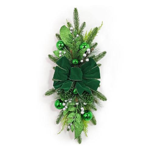 Swag per scale natalizie con luce: la ghirlanda natalizia realizzata con base di aghi di pino, decorata con un grande fiocco verde, punteggiata da decorazioni natalizie paffute, l'aspetto senza tempo rende la tua casa elegante e calda.