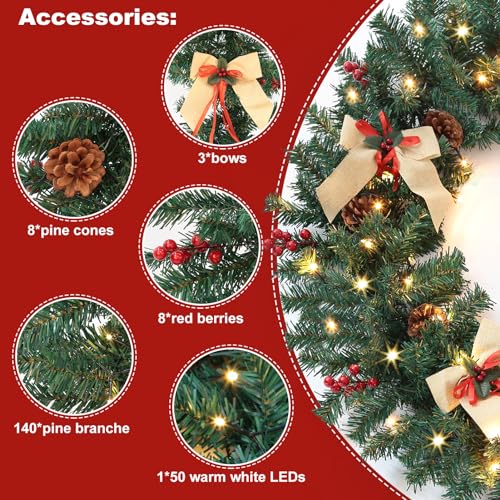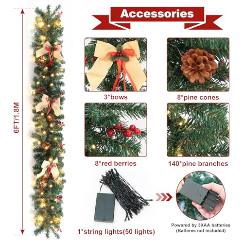 Ghirlanda Natalizia, Aoresac 1.8M Ghirlanda di Natale Artificiale con Luci, Pigne e Bacche Rosse per Casa, Camino, Mantle Frontale, Matrimonio, Natale, Festa di Natale