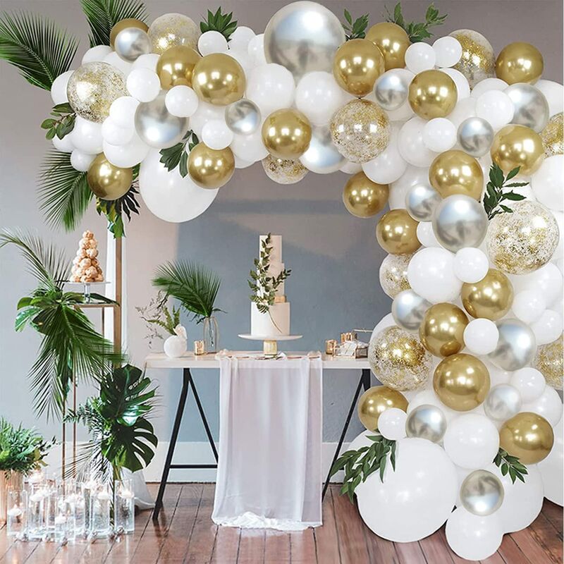 122PCS Kit arco ghirlanda di palloncini bianchi argento oro metallizzato -- Palloncini bianchi da 10 pollici (35 pezzi), palloncini bianchi e argento metallizzato da 5 pollici (40 pezzi), palloncini oro metallizzato da 12 pollici e palloncini argento metallizzato (30 pezzi), 12 Palloncini coriandoli dorati da 15 pollici (15 pezzi). Punti di colla per palloncini da 100 pezzi, striscia ad arco per palloncini lunga 16 piedi / 5 m. può Secondo i preferiti realizzare vari tipi di archi di palloncini per feste Decorazione e ghirlanda di palloncini. Si consiglia di utilizzare una pompa per gonfiare questi palloncini metallici oro argento e bianco, per aiutarti a creare facilmente una perfetta festa di matrimonio di compleanno. Set di palloncini multiuso Kit arco ghirlanda - Festa in oro bianco argento metallizzato il set di palloncini non si adatta solo alla festa di compleanno di uomini e donne, ma anche per l'addio al nubilato, una bella combinazione che lo rende adatto a una varietà di