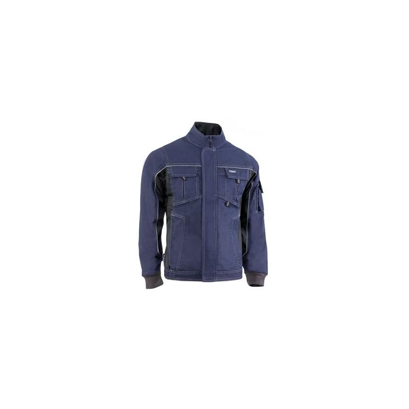 Giacca multitasche bicolore. Per ginocchiere, chiusura con zip e bottoni, rinforzo extra sul retro (zona ad alta usura). 68% cotone, 30% poliestere e 2% elastan, 260 gr/m², tessuto nero in 100% poliestere.