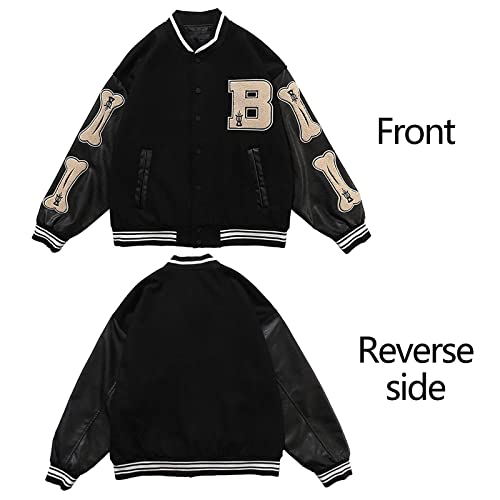 DQWD - Giacca da baseball da donna, da uomo, a maniche lunghe, con bottoni ricamati e tasca, stile casual, Nero, L
