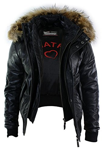 Giacca Bomber Imbottita da Uomo in Pelle Nera con Cappuccio in Vera Pelliccia nero xxl