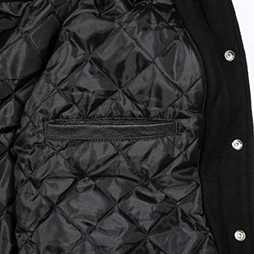Giacca classica ibrida Varsity University Letterman Bomber-Corpo in lana nera e maniche in pelle nera, Nero, S