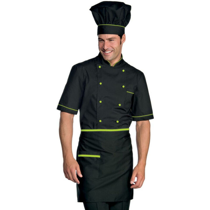 Tessuto: 65% poliestere - 35% cotone - 125 g/m² Giacca nera con piping verde su colletto, maniche e taschino sul petto Chiusura con bottoni a sfera verdi Tasca sul petto