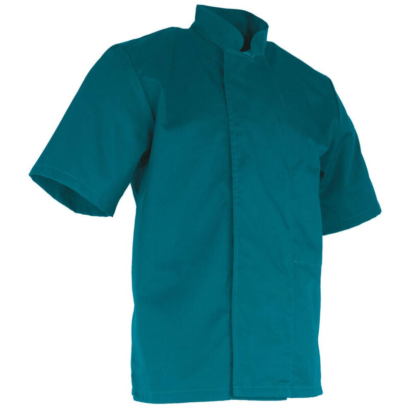 Caratteristiche: Giacca da cuoco a maniche corte Tessuto flessibile e resistente Collo da ufficiale, doppia abbottonatura con automatici nascosti Tasca per termometro (o penna) sulla manica sinistra quando indossata. 1 tasca interna. Ricamo in tinta con gli elementi della tasca Materiali: 65% poliestere;