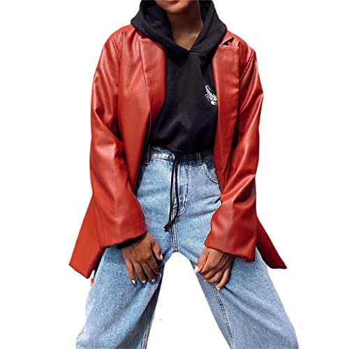 Giacca da donna in finta pelle Shacket manica lunga risvolto in pelle PU giacca oversize tinta unita pulsante giù cappotto Streetwear, Rosso, S