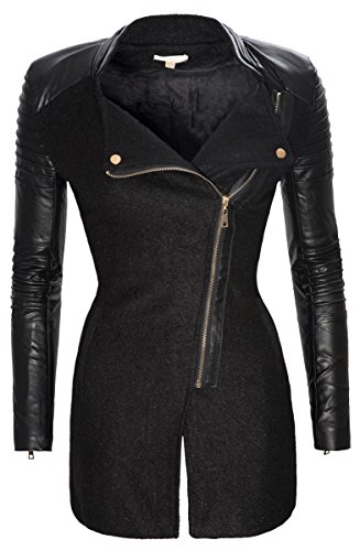 Giacca da Donna, Invernale e per mezze stagioni, di Lana, Parka con Collo Alto, Maniche In Pelle, mod. D-128 nero XL