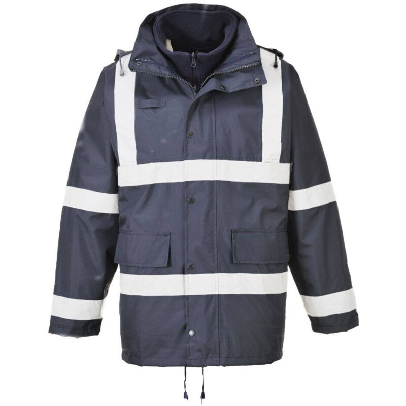 Caratteristiche: Il parka può essere indossato in 3 modi diversi (da solo, con fodera, solo fodera) Poliestere Ofxford Abrasione resistente all'acqua. Fodera in pile multiuso, indossabile da sola separatamente 6 tasche per più spazio di archiviazione Apertura frontale con bottoni a pressione per un facile accesso Zip a doppio cursore per un accesso facile e veloce Cappuccio staccabile per migliorare la funzionalità Materiale: Tessuto esterno: 100% poliestere oxford 300D rivestito in PU con finitura antimacchia 190 g Fodera in tessuto: 100% poliestere 60 g Standard: EN 343 Classe 3:1 Norma EN 343 - indumenti protettivi, protezione contro la pioggia EN 343 è la norma europea che si applica agli articoli indossati in condizioni climatiche difficili. Specifica le caratteristiche degli indumenti protettivi contro intemperie, vento e temperature intorno ai -5°...