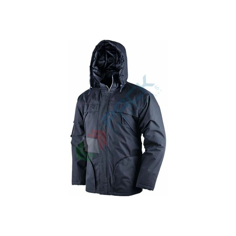 Giaccone in tessuto 65% poliestere- 35% cotone/PVC Interno in poliestere trapuntato Imbottitura in poliestere 2 tasche esterne in vita con cerniera 2 tasche esterne al petto con cerniera Tasca interna portacellulare 1 taschino sul braccio DX con patta e velcro Chiusura frontale con cerniera, ricoperta da patta con velcro Cappuccio imbottito staccabile Maniche antipioggia con polsini interni in maglia Colore: blu Taglie: S, M, L, XL, XXL