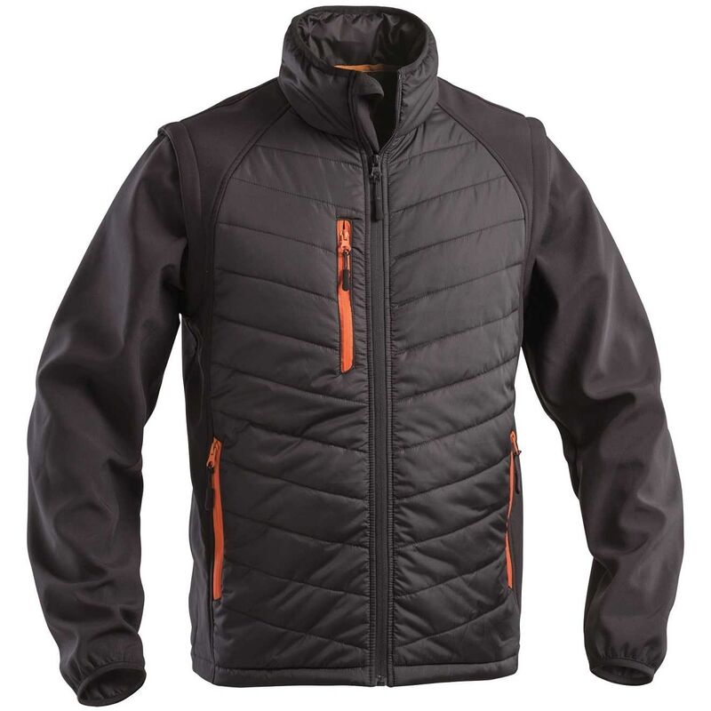 Giacca da lavoro invernale in softshell imbottita al torace. Questo giubbino da lavoro è dotato di maniche staccabili e chiusura frontale con zip a contrasto. LINEA INVERNALE GIACCA SLIDE 300D Giacca SLIDE modello con maniche staccabili, zip lunga, 2 tasche laterali ed 1 tasca al petto Colori disponibili: nero/nero con zip ed interno collo arancio Taglie: dalla S alla 3XL Tessuto: softshell e 150D poliestere mechanical stretch