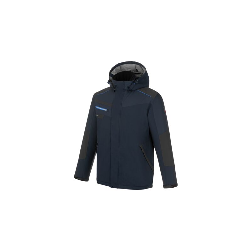 Giacca da lavoro con grafene e cappuccio Giacca invernale con cappuccio, impermeabile, con collo alto e grafene interno, colore blu scuro.. Punti di forza: 2 tasche laterali con cerniera, 1 taschino, 2 tasche interne collo foderato in pile e cappuccio staccabile, cuciture nastrate su spalle, cappuccio e fianchi impermeabilità 8.000 mm colonna d'acqua, traspirabilità 6.000 MVP strisce riflettenti, polsini con regolazione a strappo, spalle e gomiti rinforzati tessuto elasticizzato, resistente all'abrasione e ai lavaggi Composizione: 100% poliestere (riciclato) - 205 g/m², fodera con stampa grafene 100% poliestere (riciclato) - 60 g/m², imbottitura corpo 100% poliestere (riciclato) - 170 g/m²