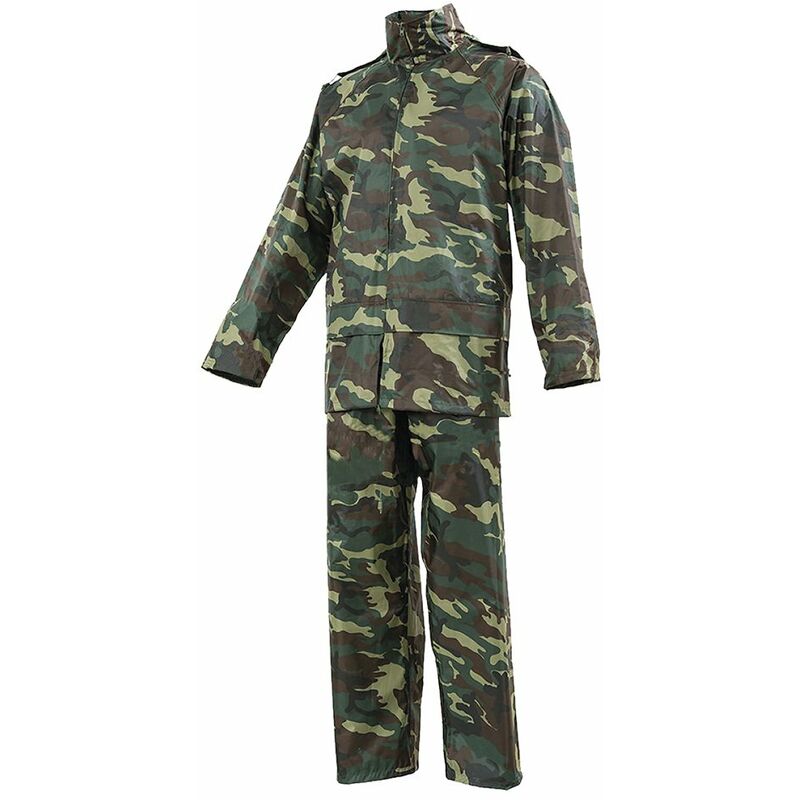 Taglia XXL Completo realizzato in 100% poliestere spalmato pvc non riciclato. Cuciture nastrate. Giacca con cappuccio fisso ripiegato all'interno del colletto, aerazione sul dorso e sotto le ascelle. Cerniera centrale ricoperta, due tasche frontali con pattina e maniche con soffietto interno antivento. Pantalone con elastico in vita, due tasche passamano e bottone al fondo. Protezione CE rischi minimi. Mimetico.