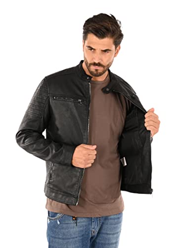 Giacca Pelle Uomo Giubbotto Biker con Collo Coreana in SimilPelle da Moto (XL, Nero)