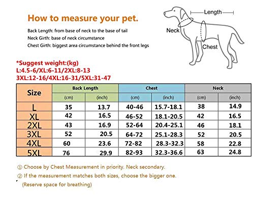 [Taglia, L-5XL] Questa giacca ha 5 taglie, adatta per cani di taglia piccola, media grande. Si prega di assicurarsi di leggere e misurare il vostro animale domestico come tabella delle taglie fornita prima di ordinare. Se tra una taglia si prega di scegliere una taglia più grande.