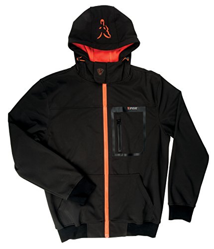 Fox, giacca in softshell, colore nero/arancione con cappuccio, giacca da pescatore, impermeabile e traspirante