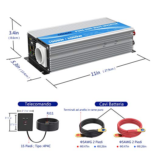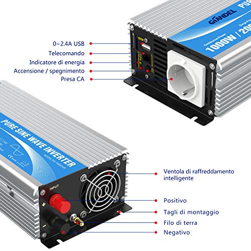 Giandel Inverter a onda sinusoidale pura: vero continuo 1000Watt onda sinusoidale pura potenza di uscita e 2000Watts picco di potenza, DC 12V ingresso, dotato di 1 prese AC e porta USB 2.4A, con cavi batteria.