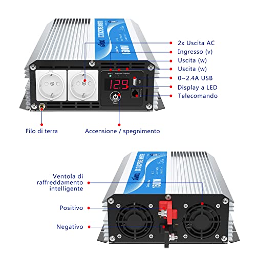 【Telecomando & display a LED】Inverter con telecomando: lunghezza del cavo 15ft, il cavo lungo ti aiuterà a controllare facilmente l'inverter ON / OFF. Display a LED facilmente per vedere la tensione di ingresso, potenza di uscita.