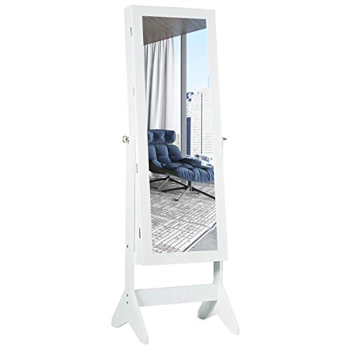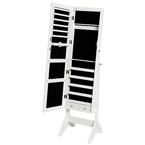 Giantex Armadietto Portagioie a Specchio, con Serratura, a Luci LED, Regolabile in Inclinazione, 6 Barre per Orecchini, 3 Strati di Ganci per Collana, 2 Cassetti, 1 Scomparto di Annelli, Bianco
