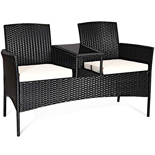 Giantex Panchina da Giardino in Polyrattan, 2 Posti, con Tavolo e Cuscino, Set da Giardino in Rattan, per Balcone, Terrazza, 138x62x85cm, 3 Colori (Bianco)