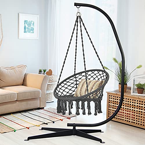 Costruzione robusta e stabile: Il supporto per amaca è fatto di robusti tubi di metallo e la superficie è completamente coperta di vernice nera, quindi è molto forte e durevole e resistente alla ruggine. Grazie al suo materiale robusto e alla sua struttura stabile, il supporto per sedia sospesa può sostenere fino a 150 kg di peso.