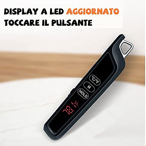 【Aspetto unico】 Progettato completamente nero con argento. La sonda pieghevole nascosta, il pulsante di calibrazione integrato, i pulsanti touch screen ti rendono più comodo da tenere in mano. Puoi appendere il termometro al gancio d'argento o semplicemente metterlo sul frigorifero o su un'altra superficie di ferro con la sua attrazione magnetica.