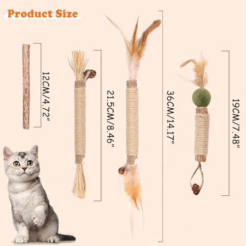 【Natural Safe Matatabi Cat Sticks】 I nostri bastoncini di vite d'argento sono fatti di vite d'argento naturale, rafia, corda di sisal e frutti di galla (frutto della vite d'argento), materiale 100% naturale e puro. Le piante naturali possono integrare vari oligoelementi per i gatti. Silvervine per gatti non contiene additivi o conservanti ed è sicuro per la salute del vostro animale domestico.