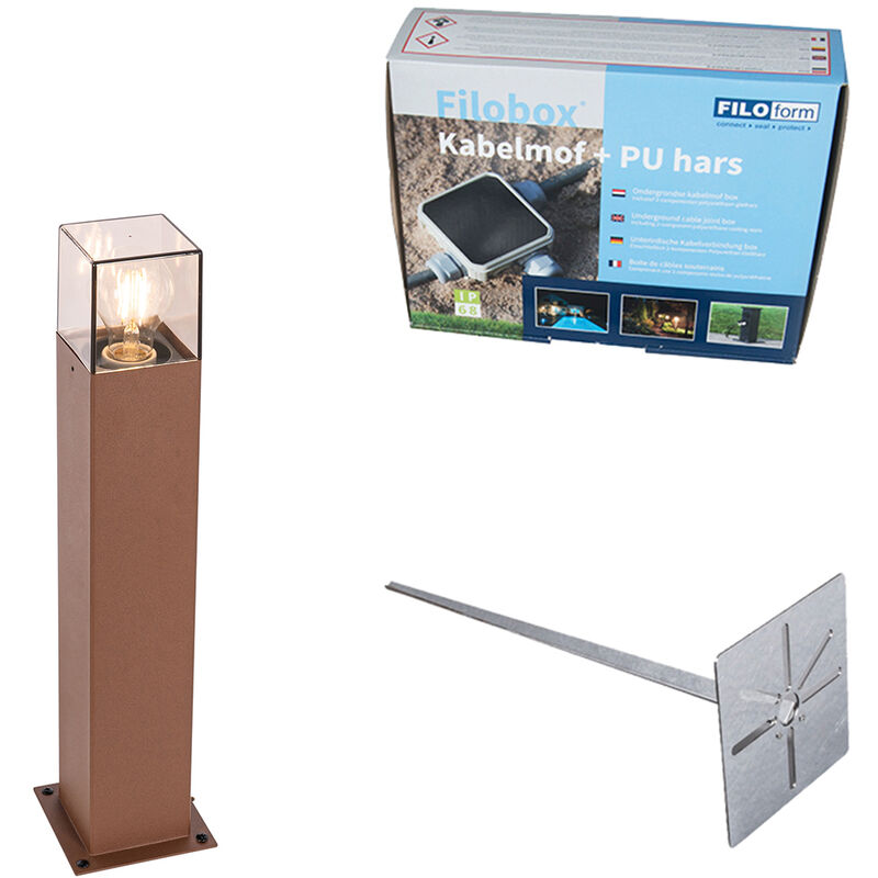 QAZQA Lampioncino 50cm picchetto di terra in ossido e kit di collegamento interrato - DENMARK Set completo per collegare facilmente la tua lampada da esterno Denmark. Lampada da esterno di alta qualità con struttura in alluminio di alta qualità con rivestimento in polvere di poliestere e paralume in plastica trasparente. Questa lampada da esterno Denmark di colore ruggine, dimmerabile e di design industriale, è progettata per illuminare in modo suggestivo il tuo giardino o patio grazie al paralume trasparente. Questa lampada Denmark ha un grado di protezione IP44, quindi è protetta dalla pioggia. Ha un'altezza di 50 cm e una lunghezza e larghezza di 8,5 cm. La lampada Denmark viene fornita senza lampadina, quindi assicurati di ordinare una lampadina con attacco E27 (attacco grande) da massimo 13 watt. Nota: se è visibile della condensa nel paralume, ciò potrebbe essere dovuto alla mancanza di emissione di calore delle lampadine LED, il che non costituisce un problema per il