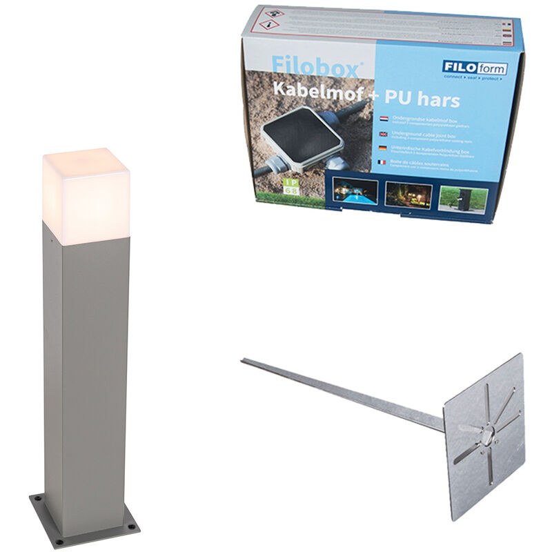 QAZQA Lampioncino con picchetto 50 cm grigio e kit collegamento interrato - DENMARK Set completo per collegare facilmente la tua lampada da esterno Denmark. Lampada da esterno di alta qualità con struttura in alluminio di alta qualità con rivestimento in polvere di poliestere e paralume in plastica. Questa moderna lampada da esterno grigia Denmark, dimmerabile, è splendidamente progettata per illuminare in modo suggestivo il tuo giardino o patio grazie al paralume opaco. Questa Denmark ha un grado di protezione IP44, quindi è protetta dalla pioggia. Ha un'altezza di 50 cm e una lunghezza e larghezza di 8,5 cm. La Denmark viene fornita senza lampadina, quindi assicurati di ordinare una lampadina con attacco E27 (attacco grande) di massimo 13 watt. Nota: se è visibile della condensa nel paralume, ciò potrebbe essere dovuto alla mancanza di emissione di calore delle lampadine LED, il che non costituisce un problema per l'apparecchio. Per evitare l'umidità nell'apparecchio, questa lampada