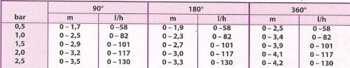 Pressione da 0,5 a 2,5 bar, portata 0 - 130 l/h