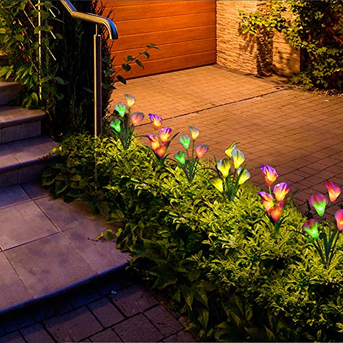 Colorate e belle: 3 confezioni di luci a forma di calla di fiori di giglio, ogni confezione ha 7 colori che cambiano per illuminare il tuo giardino e il vialetto. Perfetto per il vostro giardino, aiuole, alberi, recinzioni, marciapiedi e filato.