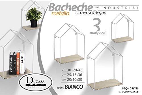 Gicos Set 3 mensole bacheca in Metallo Bianco Forma casetta con Ripiani in Legno Shabby Chic 20 * 10 * 30/25 * 15 * 36/30 * 20 * 43 cm SPQ-751738