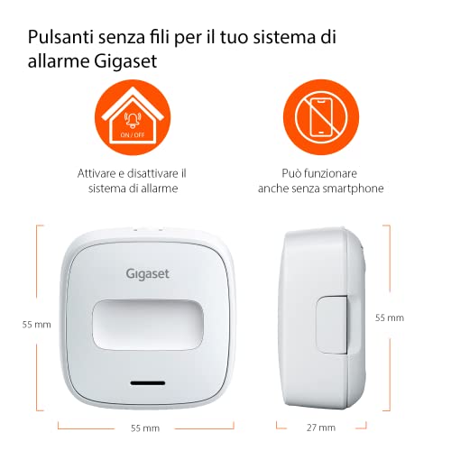 CONSEGNA - 1x Gigaset Button ONE X incl pulsanti colorati, 1x batteria al litio da 3 volt, 2x strisce adesive, 1x supporto a muro, 1x magnete, 1x guida rapida, 1x libretto di sicurezza