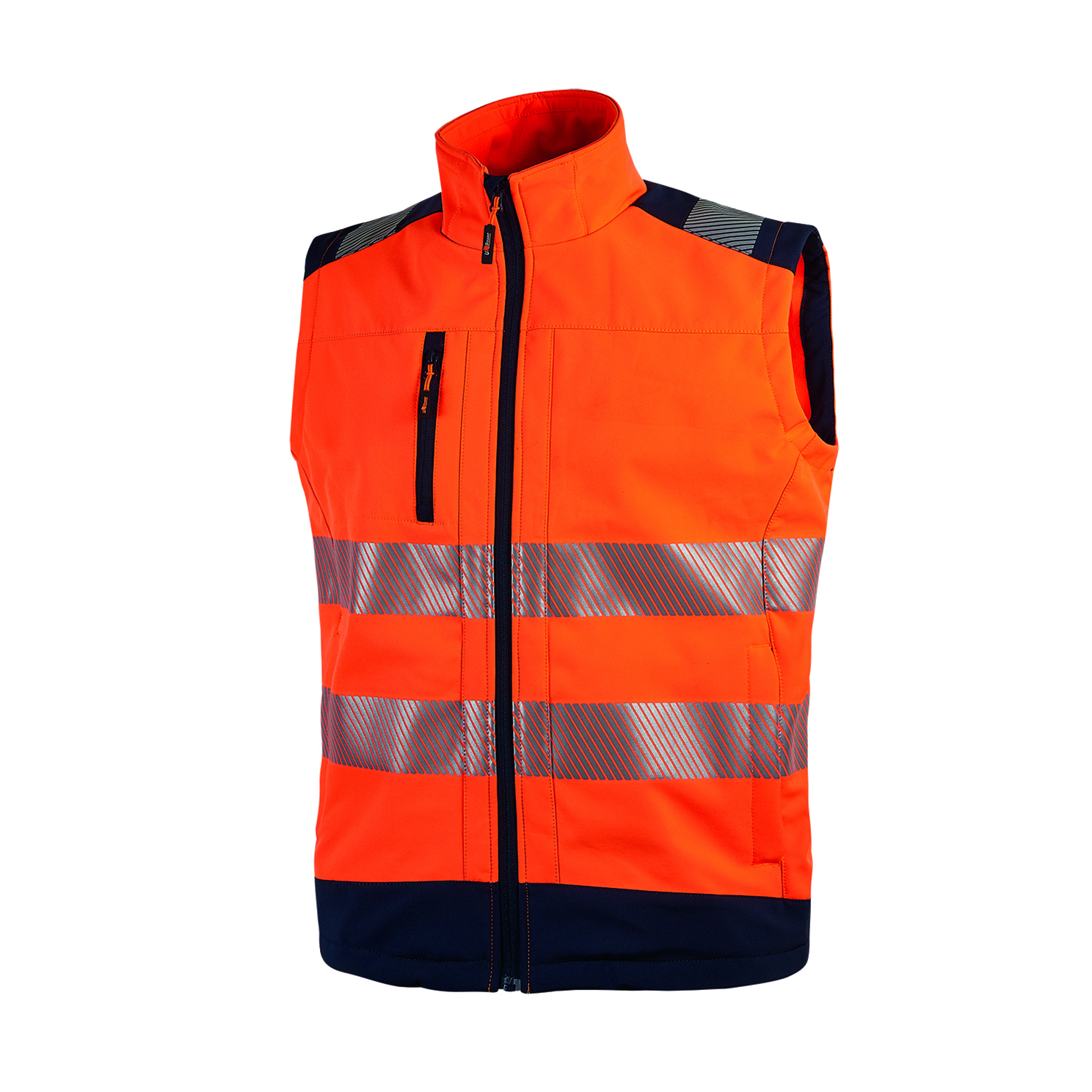 Gilet in tessuto Soft Shell stretch idrorepellente arancio flou, chiusura con zip.. Tasca portacellulare su petto con chiusura zip. Coulisse antimpigliamento regolabile dall'interno tasca, fondo sagomato.. Massimo confort