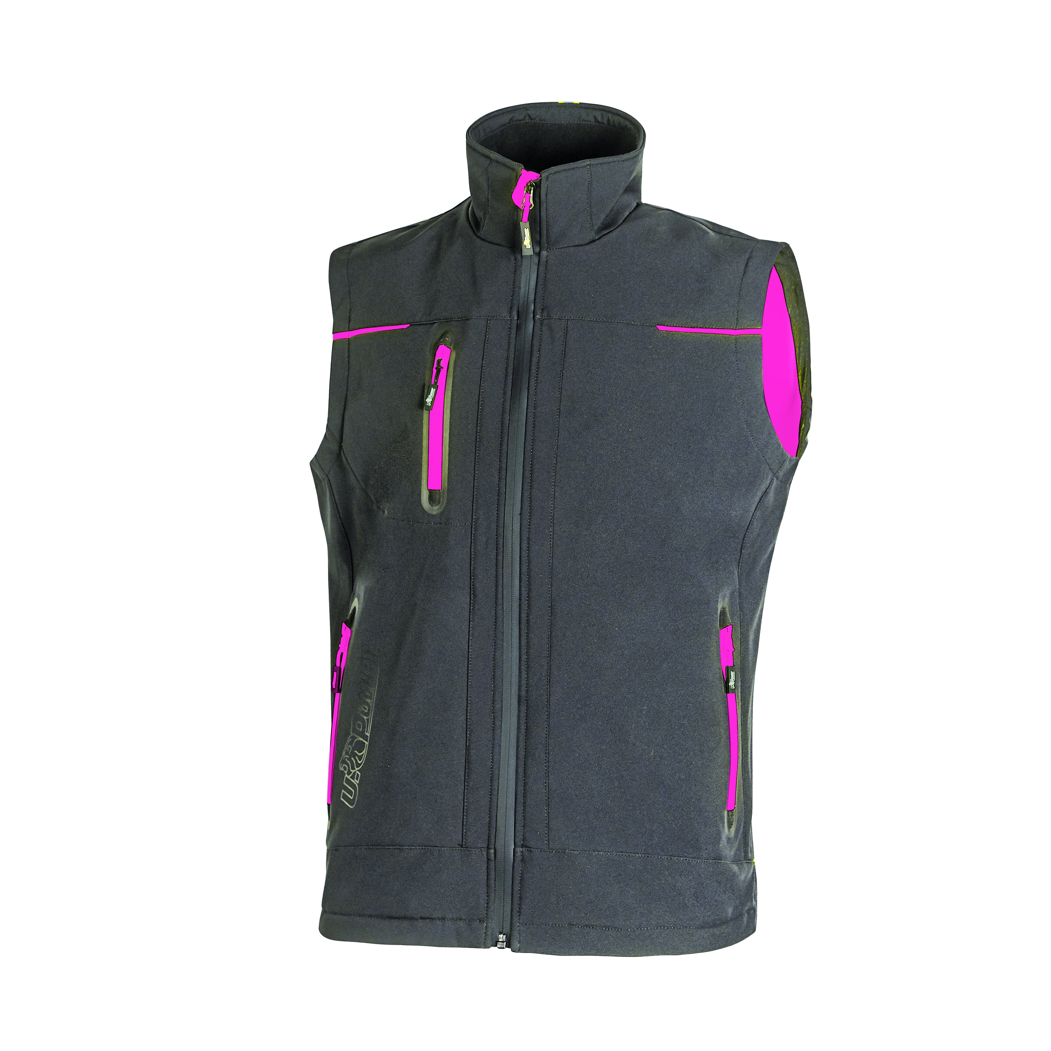 Gilet in Softshell con membrana U-Tex fucsia, con una fodera interna in morbido micro-fleece fluo e chiusura centrale con zip. Inserti in reflex per garantire la massima visibilità.. Tessuto impermeabile, traspirante e antivento.