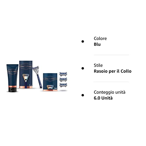 Il set da barba uomo King C. Gillette contiene 1 rasoio barba manuale per il collo e 1 confezione da 3 lamette da barba di ricambio e 1 gel da barba trasparente King C. Gillette da 150 ml. Idea regalo uomo