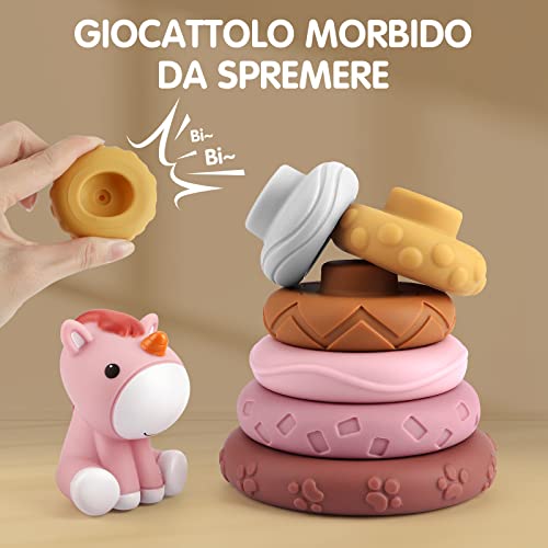 Giocattolo impilabile per cavalli: il giocattolo impilabile ha sei cerchi di diverse dimensioni e un grazioso cavallo rosa sulla parte superiore. L'aspetto color caramella, i suoni divertenti possono attirare l'attenzione del bambino, e i motivi e i motivi irregolari sulla superficie aiutano i bambini a sviluppare il senso del tatto. Un giocattolo indispensabile per i bambini