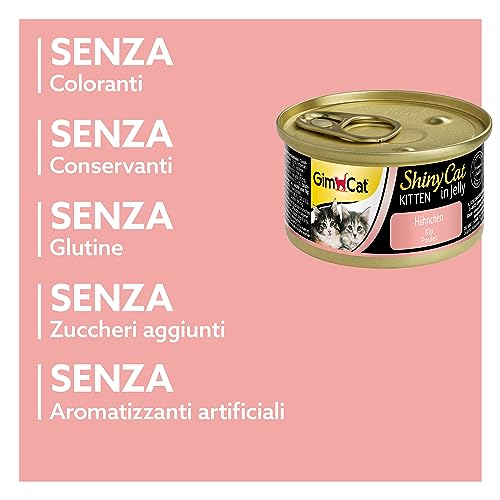 CONTENUTO: 24 scatolette 70 g GimCat ShinyCat Kitten Pollo in gelatina, alimento umido per gatti con un'alta percentuale di carne come integratore alimentare per gatti