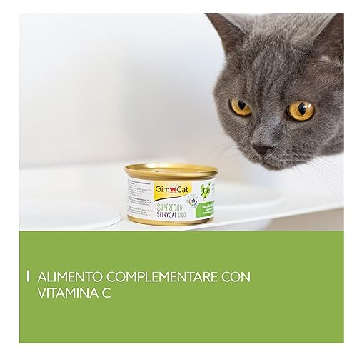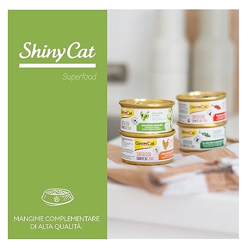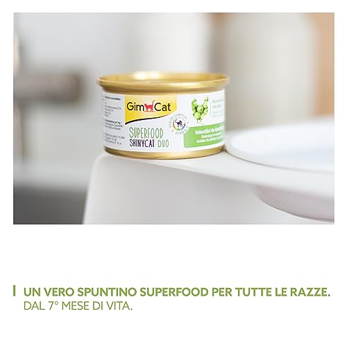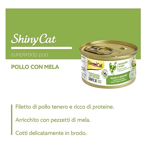 CONTENUTO: 24 scatolette di mangime per gatti, capienza di 70 g a scatoletta / GimCat Superfood ShinyCat Duo al gusto di filetto di pollo con mela