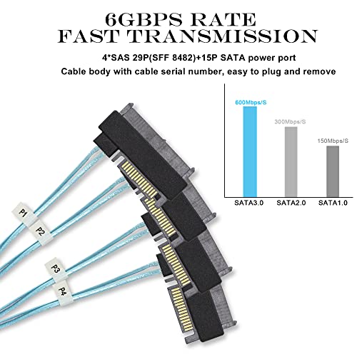 4x SAS 29 pin (SFF 8482) e 15 pin SATA, corpo del cavo con numero di serie, facile da collegare e scollegare. Doppio gruppo di schermatura foglio di alluminio, anti-interferenza, migliorare efficacemente le prestazioni di trasmissione