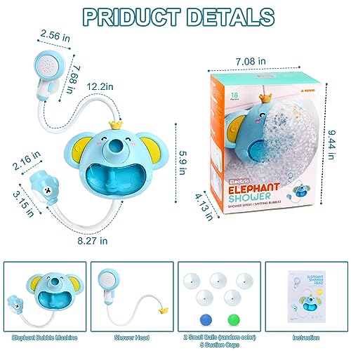 Divertimento in bagno 3 in 1 Questi giocattoli da bagno a forma di elefantino trasformano la vasca da bagno in un divertente paradiso acquatico! Punti salienti speciali sono i soffioni doccia a movimento libero, la macchina per le bolle e la fontana a sfera che soffia automaticamente (il colore della sfera è casuale).