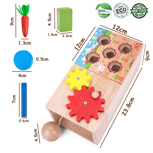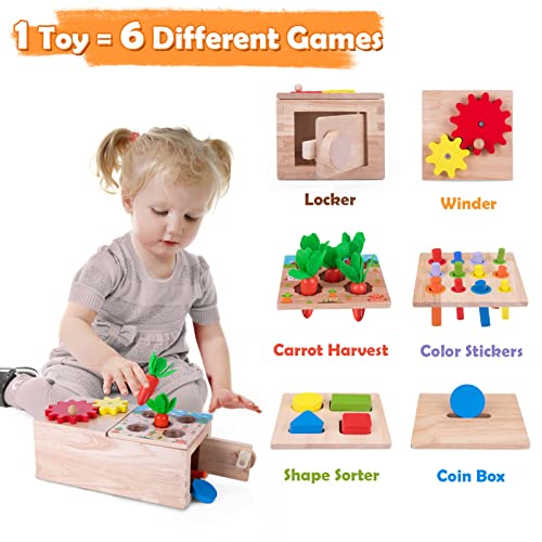 Giocattolo Montessori 6 in 1: questo giocattolo in legno dal design unico offre sei modi di giocare in un unico giocattolo, tra cui l'ordinamento delle carote, l'abbinamento dei colori, il gioco del lancio delle monete, l'abbinamento delle forme, il gioco della serratura della porta e il gioco della ruota dentata. Offri al tuo bambino ore di divertimento.