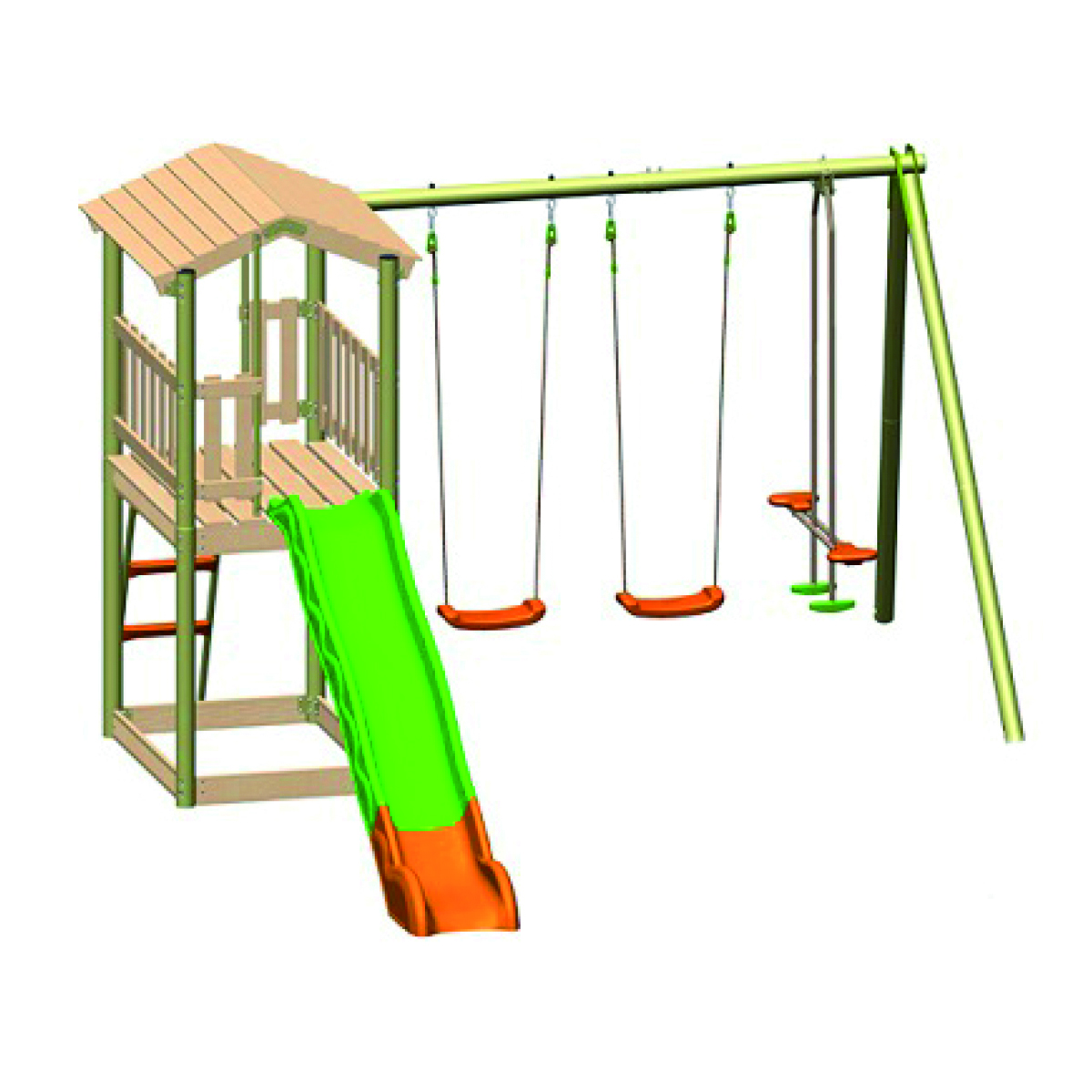 Composto da 2 altalene + cavalluccio + scivolo con torretta . Certificazione EN. 71-1-2-3-8-9. Con montanti e barra portante in metallo Ø 80 mm. Picchetti per il fissaggio a terra e la messa in sicurezza dell'area giochi inclusi nel kit.