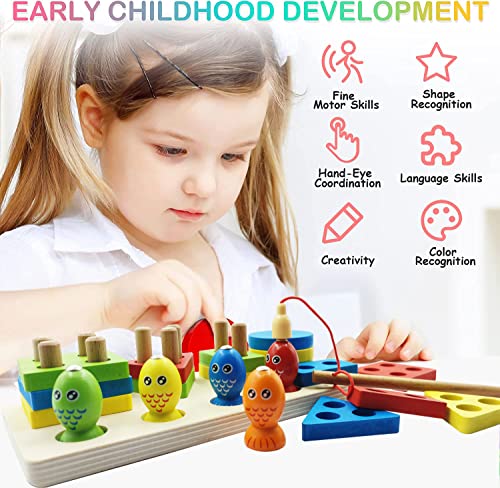 Giochi Montessori Legno Puzzle, Giocattolo Montessori Forme Geometriche Impilatore Giochi e Magnetici di Pesca in Legno Set, Giochi Educativi Impilabili Regalo Bambini 1 2 Anni
