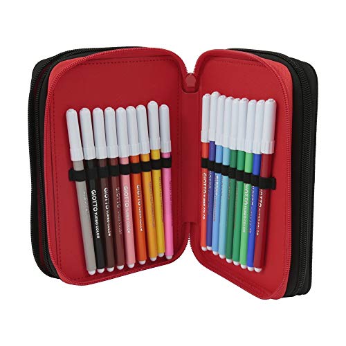 Contenuto: 18 matite colorate, 18 pennarelli, 1 pilot frixion blu, 1 penna a sfera rossa, 1 matita, 1 gomma, 1 righello, 1 temperino, 1 paio di forbici, 1 normografo